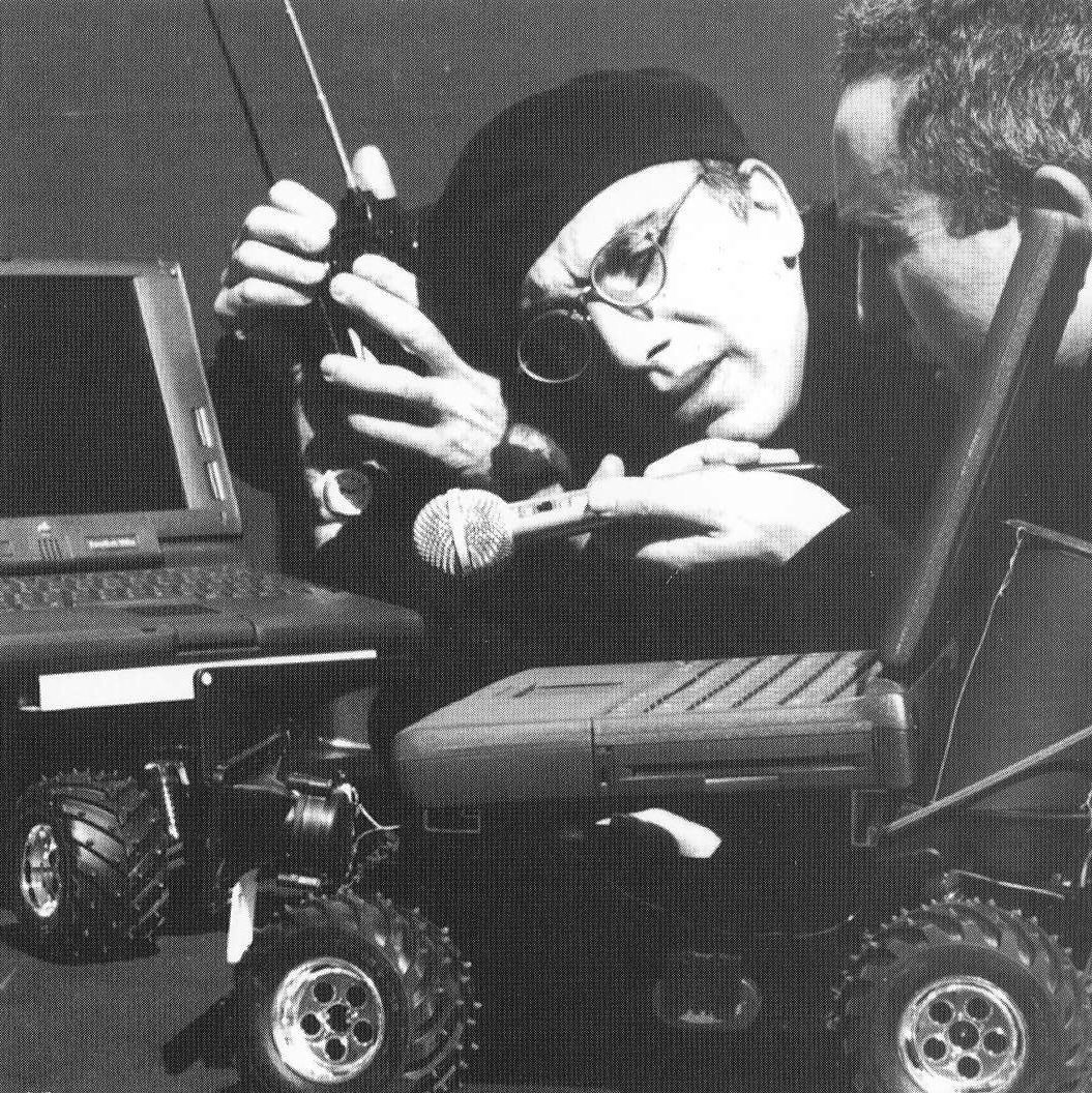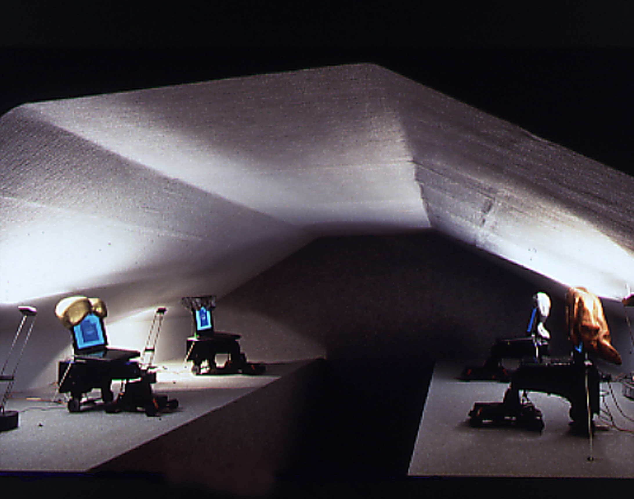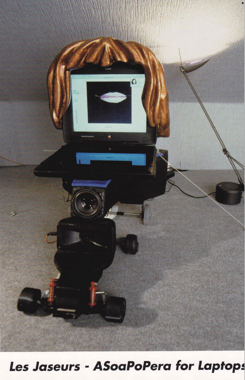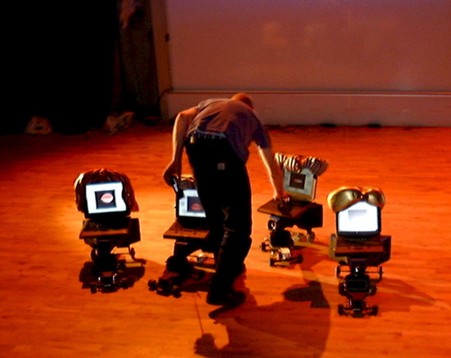 Four computers talk to one another, using synthetic voice and voice recognition software. During performances, the computers are mounted on robot vehicles. They interact with each other and the human performers. When a guitar is played, the computers sing along. In the installation format, the computers gossip with each other.