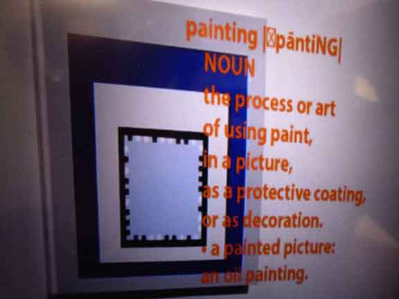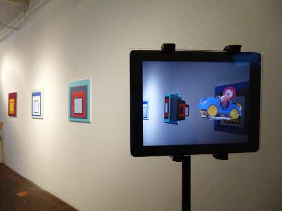 Painting tends to work within the visual context of any period. Although quite recently I feel that painting has not caught up with or understood virtual space. In particular virtual space uses isometric geometry rather than fixed point of view planar perspective. I decided to make paintings that would function as Augmented Reality markers. These define the space and allow a fixed point for walking around the augmentation. Simply putting AR markers on the wall leave the virtual space in it’s own domain. By making paintings with AR Markers there is a real dialog with both physical space and painterly space. To add to the reference I chose Josef Albers paintings because they are an indication of a structuralist approach to the language of painting. The use of Albers painting pushes the work into Post Modernism and appropriation. In new media all information is utilized because it is flattened out into rhizomatic linkage. By adding the AR markers onto the paintings they become truly net.art. I enlisted Maria Joao Salema because she is an excellent painter and we collaborate well together. The augmentations give four variations on types of art. There is realism in the self portrait, conceptual art with the text, minimalism with the extension of the painting into 3D and pop art with the toy clown car. The car and the self portrait are 3D scans that make good use of isometric geometry. The physical interface is an ipad on a rollable stand that has handles. The viewer rolls this “device for viewing paintings” around thus creating a physical interactivity as well as the virtual one that is viewed through the iPad.