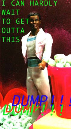 BKPC is a series of photo vignettes. The photos were originally offered on the thing bbs for download in 1993. When the internet became popular in 1994 the piece was reworked as a primitive HTML client pull animation. The piece also has been exhibited in physical form as a photo series. The work created a minor uproar when Mattel inc. sent a letter to the thing accusing it of copyright dilution and demanding that the work be removed immediately. The work focuses on interracial sex and white supremacy. It presents the point of view of a little girl playing with dolls and fantasizing about sex. - Exhibitions - 1994 - Toys/Art/Us - Castle Gallery, New Rochelle,NY - Reviews - Atkins, Robert. "The Art World & I Go On Line." - Art in America Dec. 1995: 63 - Zimmer, William. " An Exhibition in New Rochelle that Showcases Sheer Invention." Sunday New York Times [Westchester] . 1 Jan. 1995 sec. Art :12-