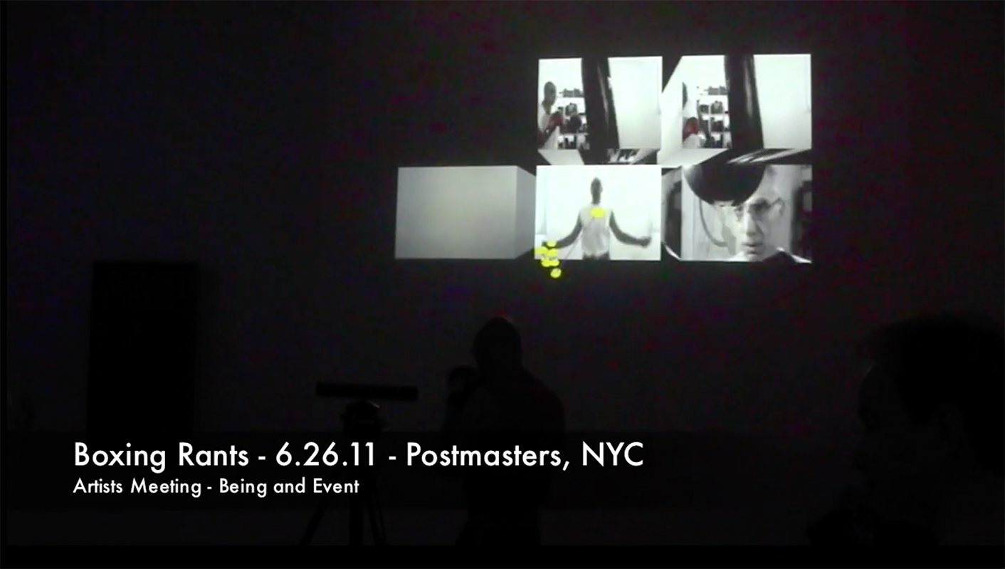 Boxing Rants extends the ideas of performance art by utilizing digital tools. I have taken videos of myself doing standard training exercises for boxing such as hitting the speed bag or heavy bag, jumping rope, shadow boxing etc.. While doing these I also speak a rant performance. These short clips are put into a computer database. I’ve written a PD program that selects these clips at random and feed them into one of nine projected cubes, mapping them onto the cubes.