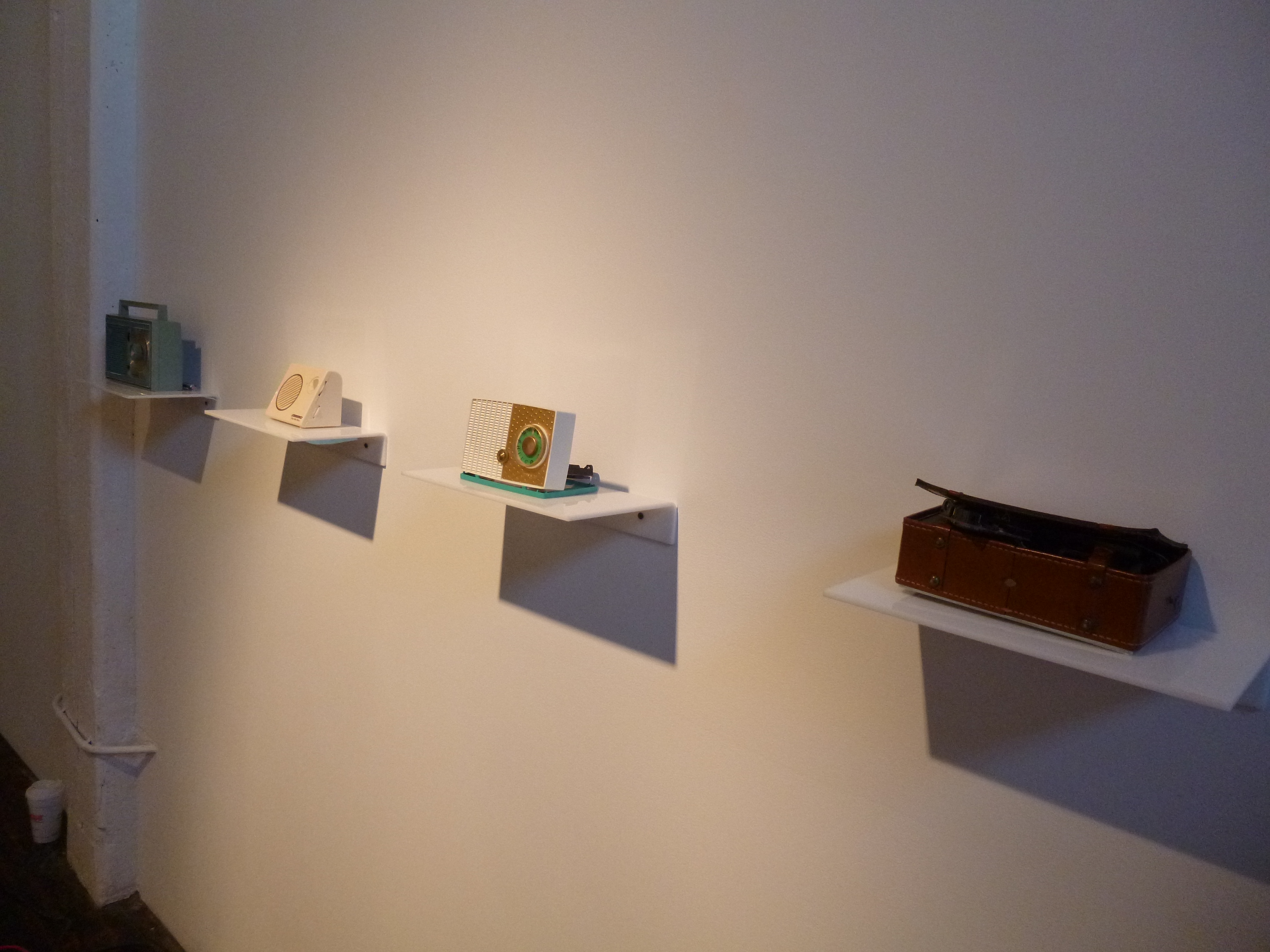 Antique portable radios retrofitted with mp3 modules. Custom database playlists are created by web download. Each radio has a unique shape and playlist.